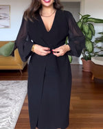 SPÉCIFICATIONS Style: Décontracté Matériel: A: 100% Polyester, B: 97% Polyester, 3% Spandex Type de la robe: Robe jambe droite Longueur de la robe: Midi Forme du col: Col rond Type du dessin: Point Type de la manche: Manches fendues Longueur de la manche: Manches 3/4 Type d'ajustement: Habituel Saison: Printemps,Automne Occasion: Quotidien Co...