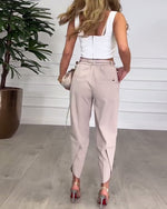 SPÉCIFICATIONS Style: Décontracté Catégorie: Combinaisons Matériel: Mélange de coton Type du dessin: Couleur pure Forme du col: Col carré Longueur de la manche: Sans manches Type du pantalon: Conique/Carotte Longueur du pantalon: Long Type d'ajustement: Habituel Saison: Printemps,Été Détails: Poche,Boutons,Froncé Occasion: Quotidien Contenu du...