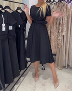 SPÉCIFICATIONS Style: Élégant Matériel: Mélange de coton Type de la robe: Robe jambe droite Longueur de la robe: Au-dessus du genou Forme du col: Col rond Type du dessin: Couleur pure Type de la manche: Manches à volants Longueur de la manche: Manches 3/4 Détails: Forage à chaud Type d'ajustement: Habituel Saison: Automne,Hiver Occasion: Quoti...