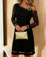 SPÉCIFICATIONS Style: Élégant Matériel: Mélange de coton Type de la robe: Robe jambe droite Longueur de la robe: Au-dessus du genou Forme du col: Col superposé Type du dessin: Paillettes Type de la manche: Manches régulières Longueur de la manche: Manches longues Détails: Couture de matériau Type d'ajustement: Habituel Saison: Automne,Hiver Oc...