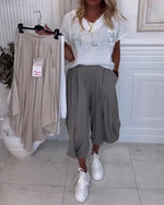 SPÉCIFICATIONS Style: Décontracté, Élégant Matériel: Dentelle, Fibre polyester Type du dessin: Couleur pure Type du pantalon: Conventionnel Longueur du pantalon: 3/4 longue Type de la taille: Taille haute Type d'ajustement: Habituel Saison: Printemps, Été, Automne Détails: Couture de matériau, Dentelle Occasion: Quotidien Contenu du colis: 1...