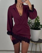 SPÉCIFICATIONS Style: Élégant,Faire la fête Matériel: Mélange de coton Type de la robe: Asymétrique Longueur de la robe: Au-dessus du genou Forme du col: Col à revers Type du dessin: Couleur pure Type de la manche: Manches régulières Longueur de la manche: Manches longues Détails: Couture de matériau,Boutons,Dentelle Type d'ajustement: Habitue...