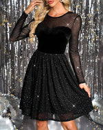 SPÉCIFICATIONS Style: Faire la fête Matériel: Gaze,Tricotage Type de la robe: Robe jambe droite Longueur de la robe: Longueur du genou Forme du col: Col rond Type du dessin: Point Type de la manche: Manches évasées Longueur de la manche: Manches longues Détails: Couture de matériau Type d'ajustement: Habituel Saison: Automne,Hiver Occasion: Qu...