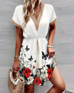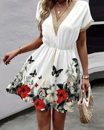 Robe col V en dentelle imprimé papillon