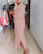 SPÉCIFICATIONS Style: Décontracté Matériel: Mélange de coton Type de la robe: Robe jambe droite Longueur de la robe: Midi Forme du col: Col en V Type du dessin: Paillettes,Couleur pure Type de la manche: Manches régulières Longueur de la manche: Manches longues Type d'ajustement: Habituel Saison: Automne,Hiver Occasion: Quotidien Contenu du co...