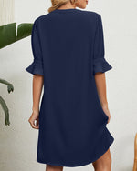 SPÉCIFICATIONS Style: Décontracté Matériel: Mélange de coton Type de la robe: A-Line Longueur de la robe: Au-dessus du genou Forme du col: Col en V Type du dessin: Paillettes,Couleur pure Type de la manche: Manches à volants Longueur de la manche: Manches longues Détails: Volants Type d'ajustement: Ample Saison: Automne,Hiver Occasion: Quotidi...