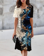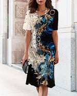 SPÉCIFICATIONS Style: Élégant Matériel: Mousseline,Fibre polyester Type de la robe: A-Line Longueur de la robe: Midi Forme du col: Col en V Type du dessin: Impression Type de la manche: Manches régulières Longueur de la manche: Manches courtes Détails: Couture de matériau, Lacet Type d'ajustement: Habituel Saison: Printemps, Été, Automne Occ...