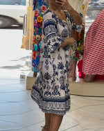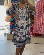 Robe Col Rond Imprimée Manches Courtes Trompette
