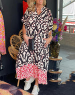 SPÉCIFICATIONS Style: Décontracté Matériel: Mélange de coton Type de la robe: A-Line Longueur de la robe: Midi Forme du col: Col à revers Type du dessin: Impression Type de la manche: Manches régulières Longueur de la manche: Manches neuf points Type d'ajustement: Habituel Saison: Printemps,Été Occasion: Quotidien Contenu du colis: 1 x Robe TA...