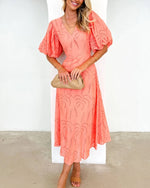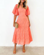 SPÉCIFICATIONS Style: Décontracté Matériel: Mélange de coton,Dentelle Type de la robe: Robe jambe droite Longueur de la robe: Maxi Forme du col: Col en V Type du dessin: Couleur pure Type de la manche: Manches évasées Longueur de la manche: Manches 3/4 Détails: Couture de matériau,Poche,Froncé Type d'ajustement: Habituel Saison: Printemps,Auto...