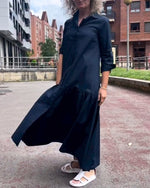 SPÉCIFICATIONS Style: Décontracté Matériel: Mélange de coton Type de la robe: Robe jambe droite Longueur de la robe: Midi Forme du col: Col à revers Type du dessin: Couleur pure Type de la manche: Manches régulières Longueur de la manche: Manches longues Détails: Couture de matériau,Boutons Type d'ajustement: Habituel Saison: Automne,Hiver Occ...