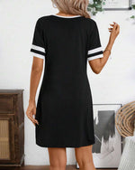 SPÉCIFICATIONS Style: Décontracté Matériel: Mélange de coton Type de la robe: A-Line Longueur de la robe: Au-dessus du genou Forme du col: Col rond Type de la manche: Manches régulières Longueur de la manche: Manches courtes Détails: Couture de matériau Type d'ajustement: Habituel Saison: Printemps,Automne,Hiver Occasion: Quotidien Contenu du ...