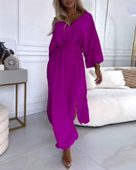 SPÉCIFICATIONS Style: Décontracté Matériel: Mélange de coton,Dentelle Type de la robe: Robe jambe droite Longueur de la robe: Maxi Forme du col: Col en V Type du dessin: Couleur pure Type de la manche: Manches évasées Longueur de la manche: Manches 3/4 Détails: Couture de matériau,Poche,Froncé Type d'ajustement: Habituel Saison: Printemps,Auto...