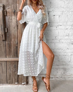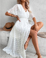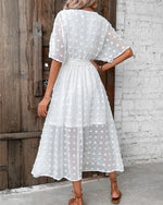 SPÉCIFICATIONS Style: Élégant,Faire la fête Matériel: Mélange de coton,Gaze Type de la robe: Robe jambe droite Longueur de la robe: Longueur du genou Forme du col: Col en V Type du dessin: Point Type de la manche: Manches bouffantes Longueur de la manche: Manches neuf points Détails: Couture de matériau,Poche Type d'ajustement: Habituel Saison...