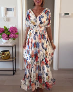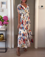 SPÉCIFICATIONS Style: Élégant Matériel: Mousseline,Fibre polyester Type de la robe: A-Line Longueur de la robe: Midi Forme du col: Col en V Type du dessin: Impression Type de la manche: Manches régulières Longueur de la manche: Manches courtes Détails: Couture de matériau, Lacet Type d'ajustement: Habituel Saison: Printemps, Été, Automne Occ...