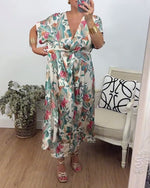 SPÉCIFICATIONS Style: Élégant Matériel: Mousseline,Fibre polyester Type de la robe: A-Line Longueur de la robe: Midi Forme du col: Col en V Type du dessin: Impression Type de la manche: Manches régulières Longueur de la manche: Manches courtes Détails: Couture de matériau, Lacet Type d'ajustement: Habituel Saison: Printemps, Été, Automne Occ...