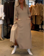 SPÉCIFICATIONS Style: Décontracté Matériel: Mélange de coton Type de la robe: Robe jambe droite Longueur de la robe: Midi Forme du col: Col à revers Type du dessin: Couleur pure Type de la manche: Manches régulières Longueur de la manche: Manches longues Détails: Couture de matériau,Boutons Type d'ajustement: Habituel Saison: Automne,Hiver Occ...