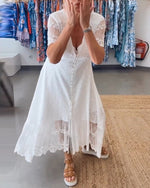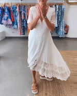 SPÉCIFICATIONS Style: Élégant,Faire la fête Matériel: Mélange de coton,Gaze Type de la robe: Robe jambe droite Longueur de la robe: Longueur du genou Forme du col: Col en V Type du dessin: Point Type de la manche: Manches bouffantes Longueur de la manche: Manches neuf points Détails: Couture de matériau,Poche Type d'ajustement: Habituel Saison...