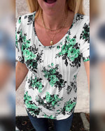 T-Shirt Col-V Imprimé Feuille Manches Courtes