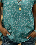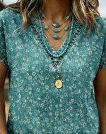T-Shirt Col-V Imprimé Feuille Manches Courtes